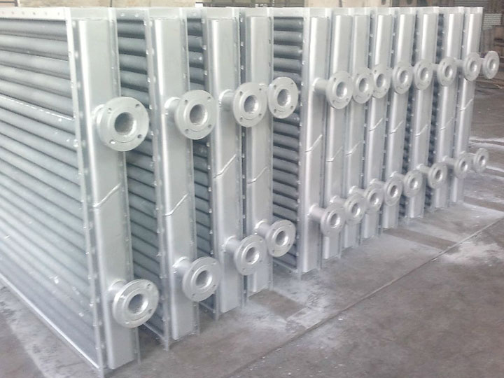 翅片式換熱器主要用于干燥系統中空氣加熱,是熱風裝置中的主要設備,散熱器采用的熱介質可以是蒸汽或熱水,也可用導熱油,蒸氣的工作壓力一般不超過0.8Mpa,熱空氣的溫度在150℃以下。
