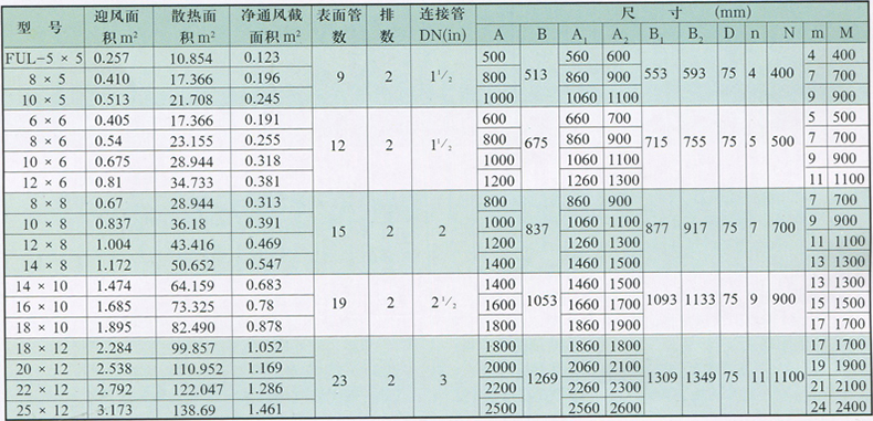 FUL型散熱器可有不同表面管長、管數及排數組成多種規格,其流程可根據用戶需要制成雙流程、三流程、四流程及多流程、使用部門可根據需要任意選用。
