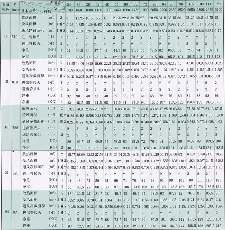 如采用兩排,片距為3.2mm,表面管數(shù)為21,管長(zhǎng)為60英寸,則為UⅡ——2(R)——21——60。